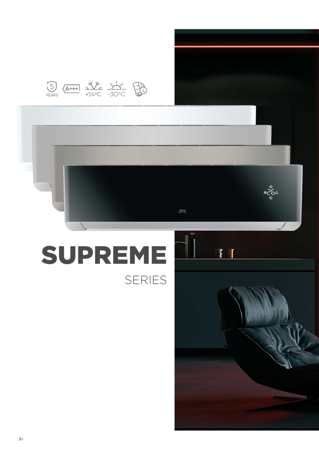 A Supreme modell a csúcskategóriás fali klímaberendezés. Akár 18 dB(A) zajszinttel is csendes , és rendkívül hatékony , különösen fűtés üzemmódban. A kétfokozatú kompresszornak és a beépített tálcafűtésnek köszönhetően a készülék akár -30°C-on is hatékonyan működhet , akár elsődleges hőforrásként is. A Supreme egyik fő előnye a magas energiabesorolás, amely mindkét üzemmódban akár A+++ . Ezenkívül a Supreme alapfelszereltségként automatikus függőleges és vízszintes redőnyökkel, Wi-Fi vezérléssel, plazma ionizátorral és energiatakarékos funkcióval rendelkezik. A standard vezérlő egy vezeték nélküli távirányító (a modellek a készüléksorozattól függően eltérőek lehetnek), de a klímaberendezés számos opcionális vezérlővel felszerelhető .